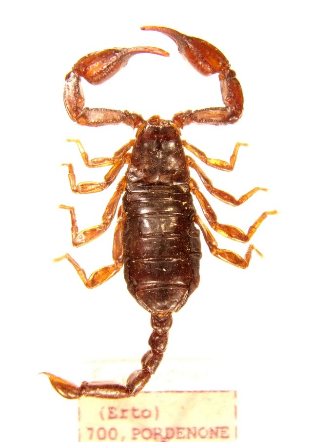 Queste foto non sono molto ideali, comunque dalla località e da quel poco che si vede probabilmente è un E. germanus, feminna direi adulta. La lunghezza nei scorpioni va presa dalla limite distale del carapace alla punta del aculeo con metasoma e telson distesi :bln: