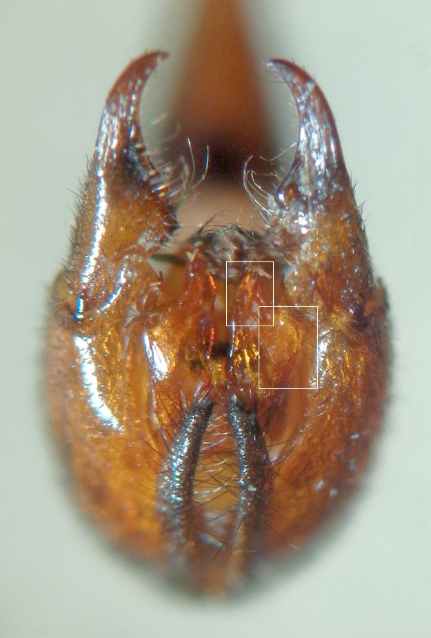 - parameri brevemente bifidi all'apice e con largo lobo esterno sottostante (riquadri in 4a foto).