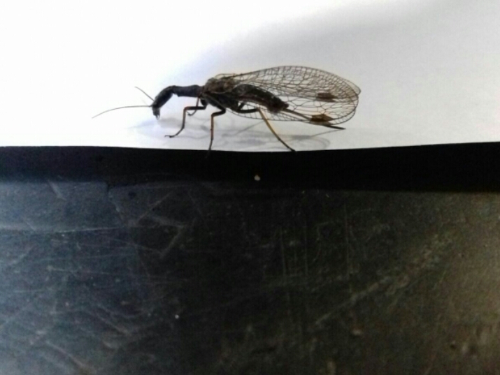 Si tratta di una femmina di Rafidiottero (stretto parente dei Neurotteri), e mi pare un Phaeostigma notatum. Ma da quel che sappiamo questa specie è alpina e lì non ci dovrebbe essere. Va detto però che identificarli così da una foto, neppure troppo dettagliata, è un azzardo.
