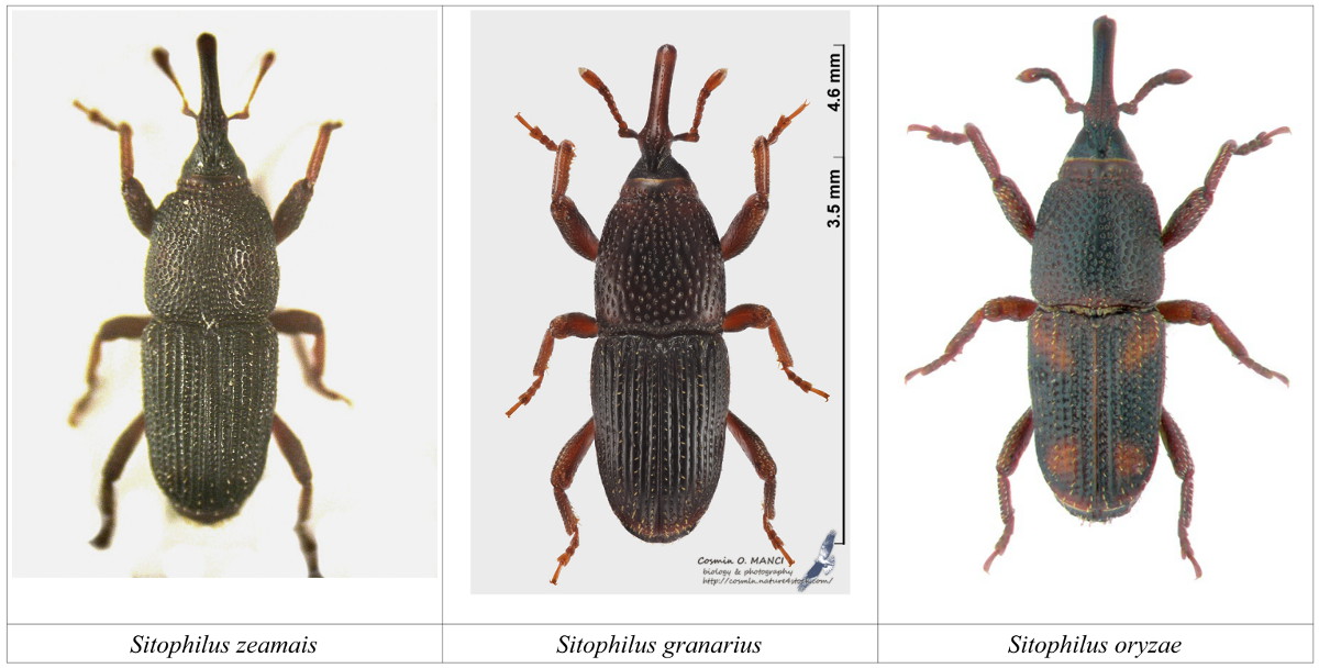 Nel sito CABI - Invasive Species Compendium, alla pagina relativa al S. zeamais ( https://www.cabi.org/isc/datasheet/10926 ) si legge: "S. zeamais adult is usually blacker than S. oryzae, with fine microsculpture and is more shiny. Scutellum with lateral elevations further apart than their longitudinal length which is about half as long as the scutellum".