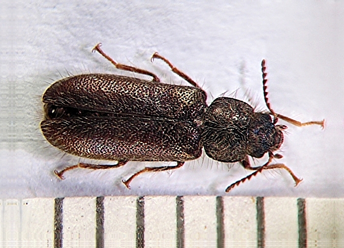 No, è un Aplocnemus, genere ben riconoscibile dalle unghie con un'appendice che le fa sembrare doppie. Per le tempie allungate, e la pubescenza lunga e grigia chiara, dovrebbe trattarsi di A. jejunus Kiesenwetter, femmina.