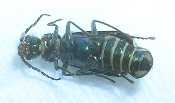 Quando vola questo Malachiidae mostra il dorso dell'addome rosso, e fa lo "Spirito Santo" prima di posarsi sulle spighe delle graminacee. Lunghezza ca. 6,5 mm. |
