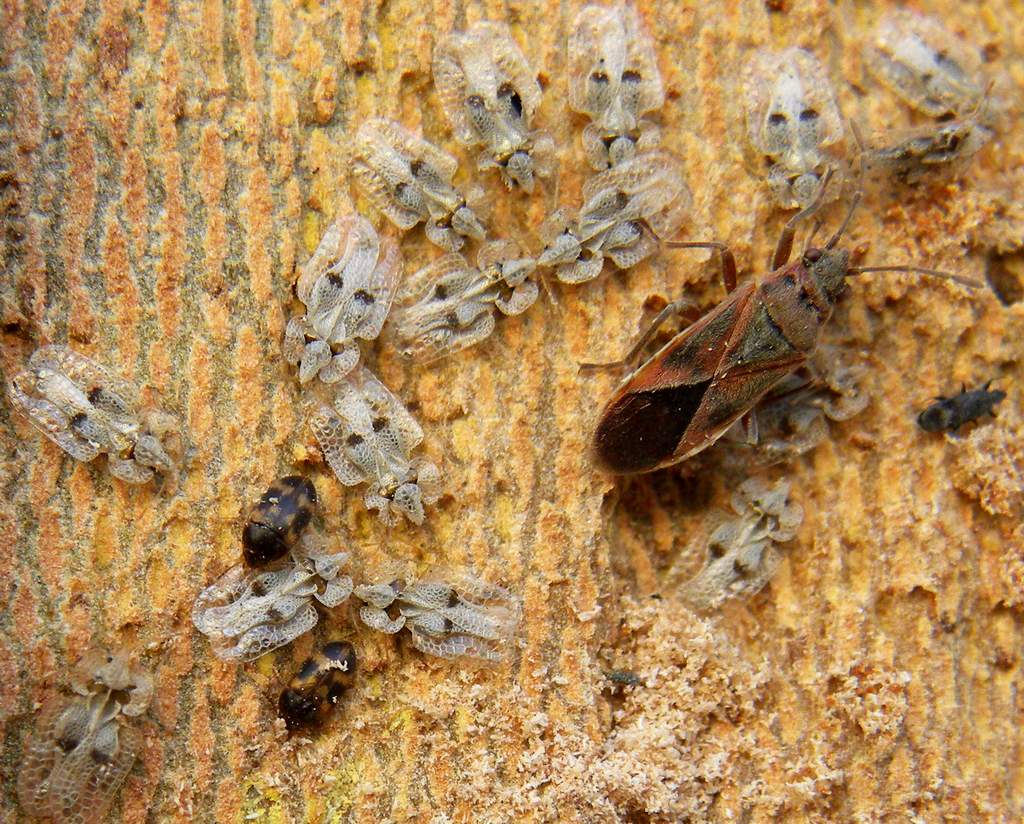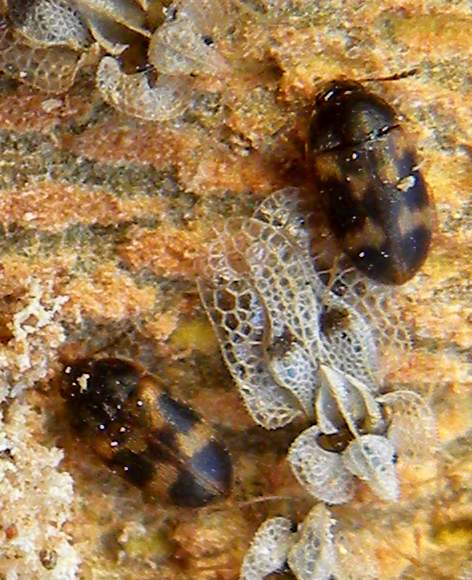 In questo assembramento di cimici svernanti sotto corteccia di platano spuntano anche due piccoli coleotteri . A qule famiglia appartengono?