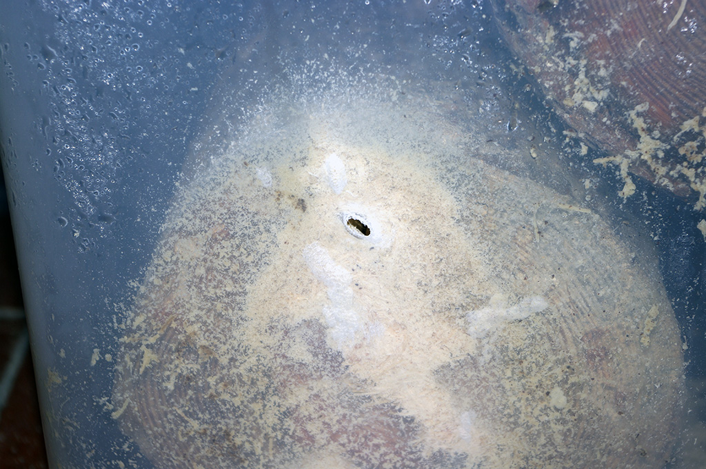 Una delle larve ancora in via di sviluppo nel legno, era arrivata con la galleria a sbucare ad una estremità di uno dei pezzi di tronco di pino (si vede dalla foto il mucchietto di segatura alla base). Ebbene, anzichè fare come le altre ... e tornare indietro, o cambiare direzione, ha pensato bene di "continuare" la galleria sulla scatola di plastica ... perforandola (la sezione di taglio di quel tronco era vicinissima alla parete frontale della scatola).