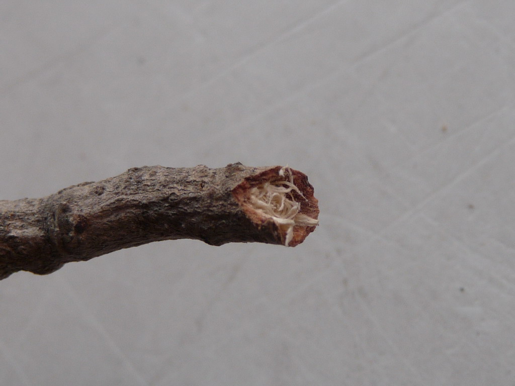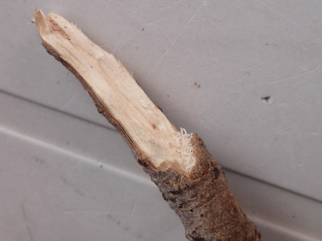 E questa l'estremità, dove quando l'ho staccato sbucava una bella larvetta, con la testa piatta e tonda tipica di Cerambicidi e Buprestidi, che ora dev'essere andata verso l'apice: