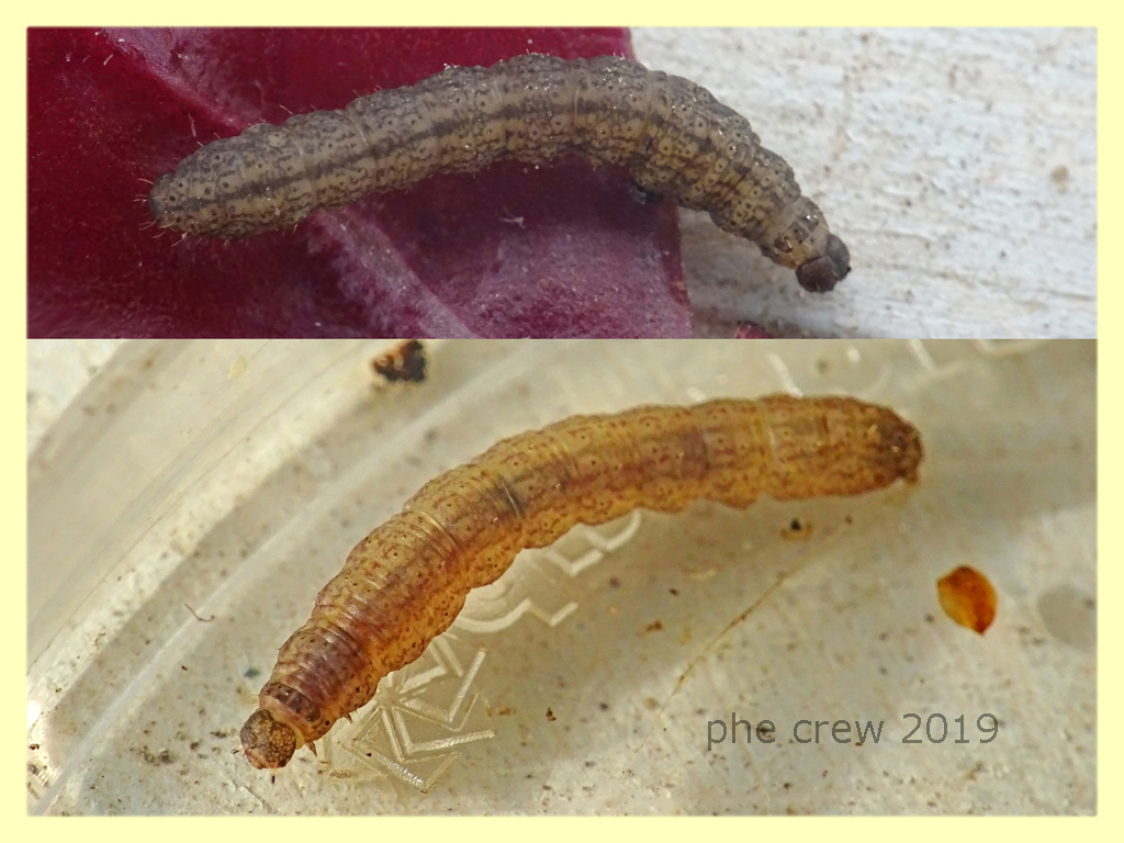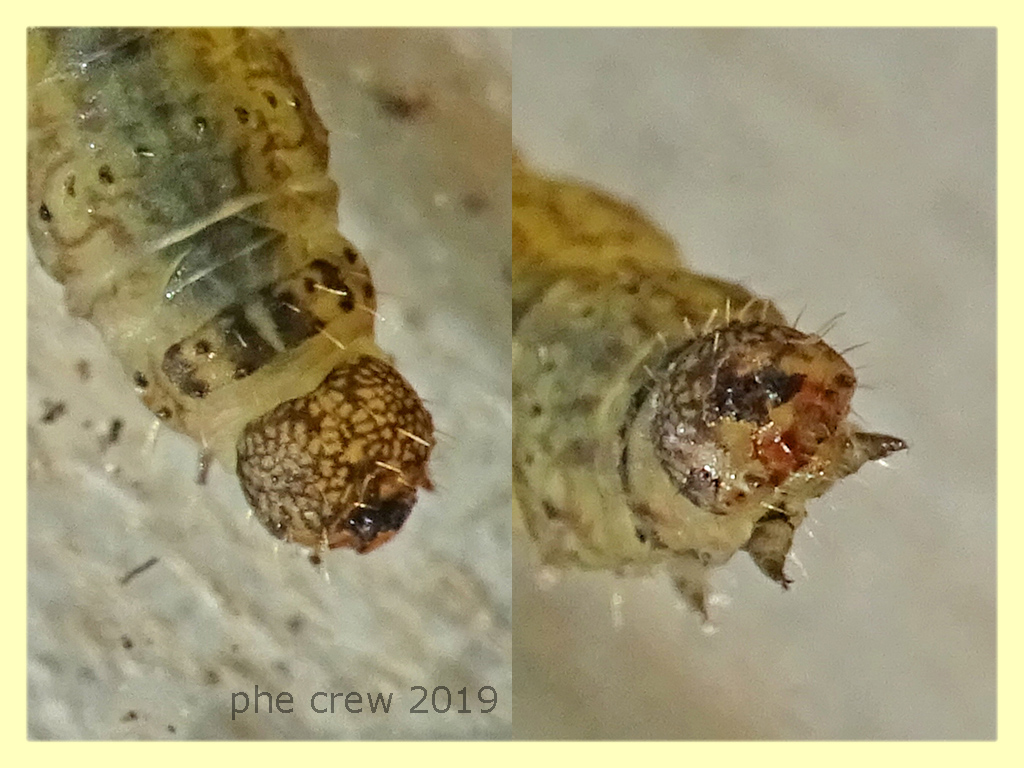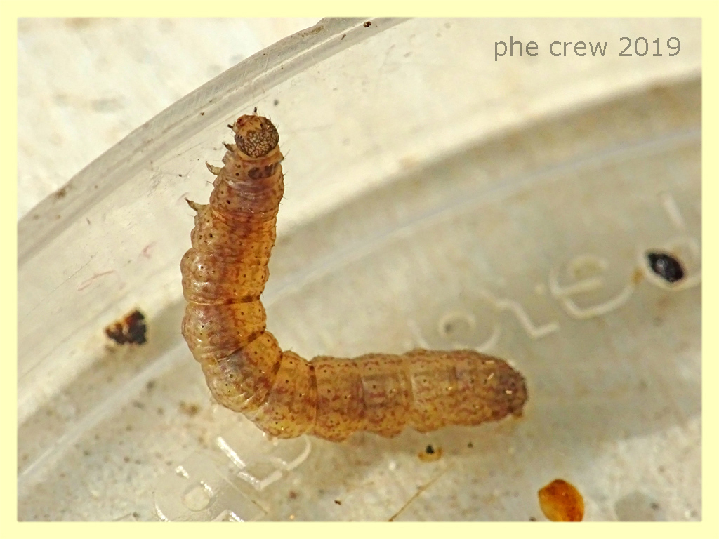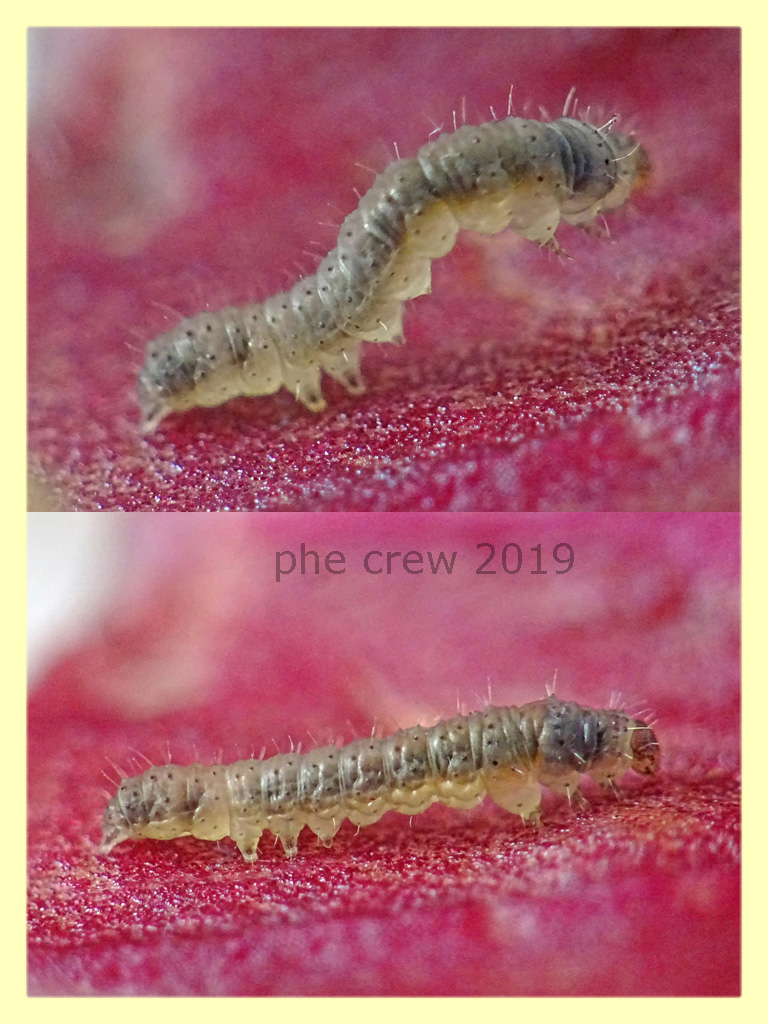 ...ad oggi, 20.11.2019, le poche larve che sono rimaste (4/5) ancora sopravvivono e hanno raggiunto i 5 mm. Sono molto lente sia nei movimenti che nella crescita ma sara' colpa delle basse temperature. Ho poi messo anche altre foglie da allora: Tarassaco, Parietaria, Plantago, Malva e altre piante nostrane ma ho notato che dal Radicchio nel cambiare dieta ci hanno messo un po, alla fine hanno assaggiato un po tutto e non ho ancora capito se la loro scelta sia il Plantago. Allego una foto di una delle larve. A presto