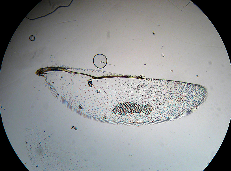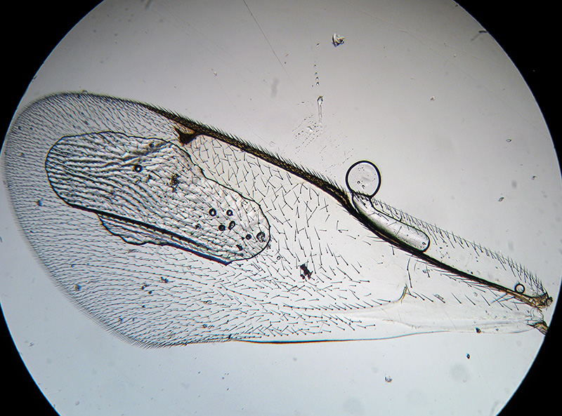 ho fotografato le ali,nel caso fossero importanti per una possibile determinazione della specie; ala anteriore sinistra e posteriore destra a 40x... il campo inquadrato è di mm 3x2: