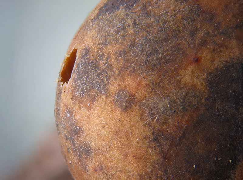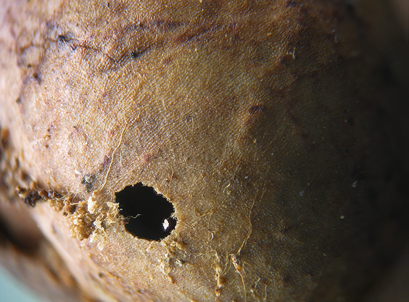 Aggiungo per concludere altre immagini; i fori di sfarfallamento di due delle tre galle dalle quali sono fuoriusciti gli Imenotteri: