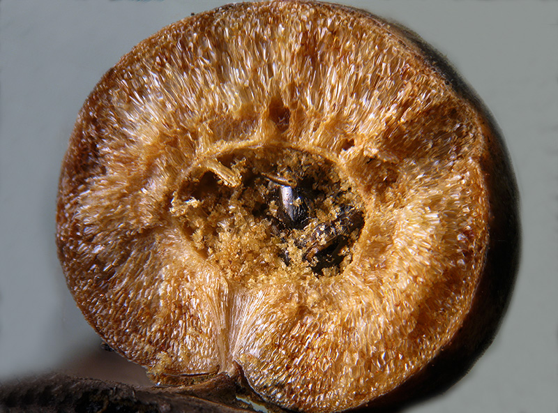Ho poi sezionato le galle rimanenti; una era completamente vuota pur presentando la cavità che avrebbe potuto ospitare un Insetto. Una conteneva una muffa di colore verde:
