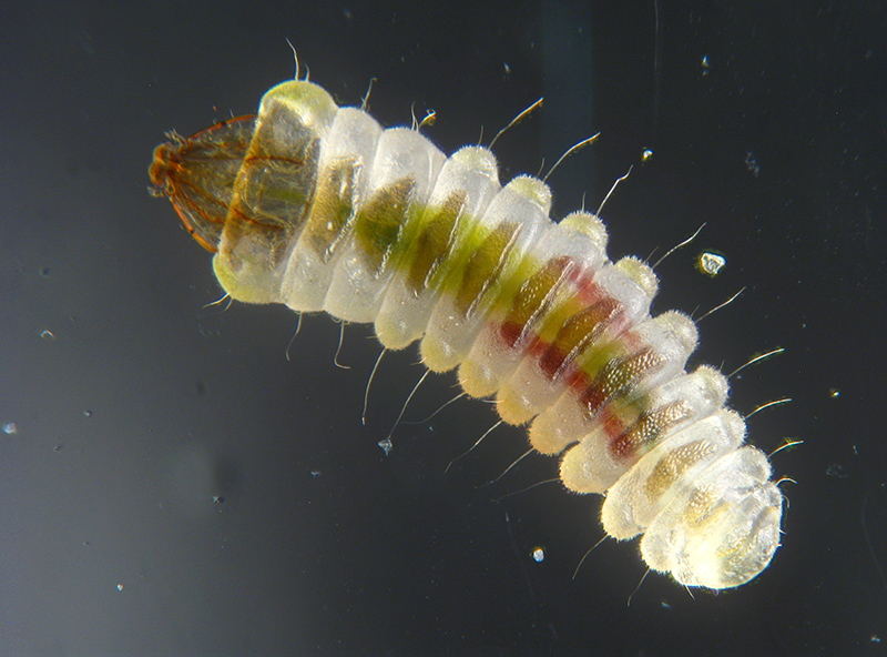 larva al microscopio in luce trasmessa, c.i. mm 2,5x2: