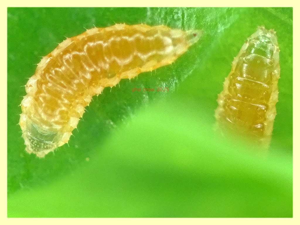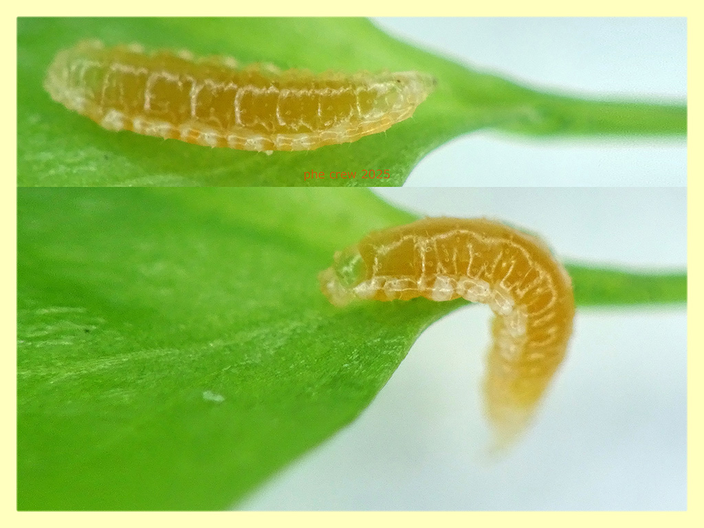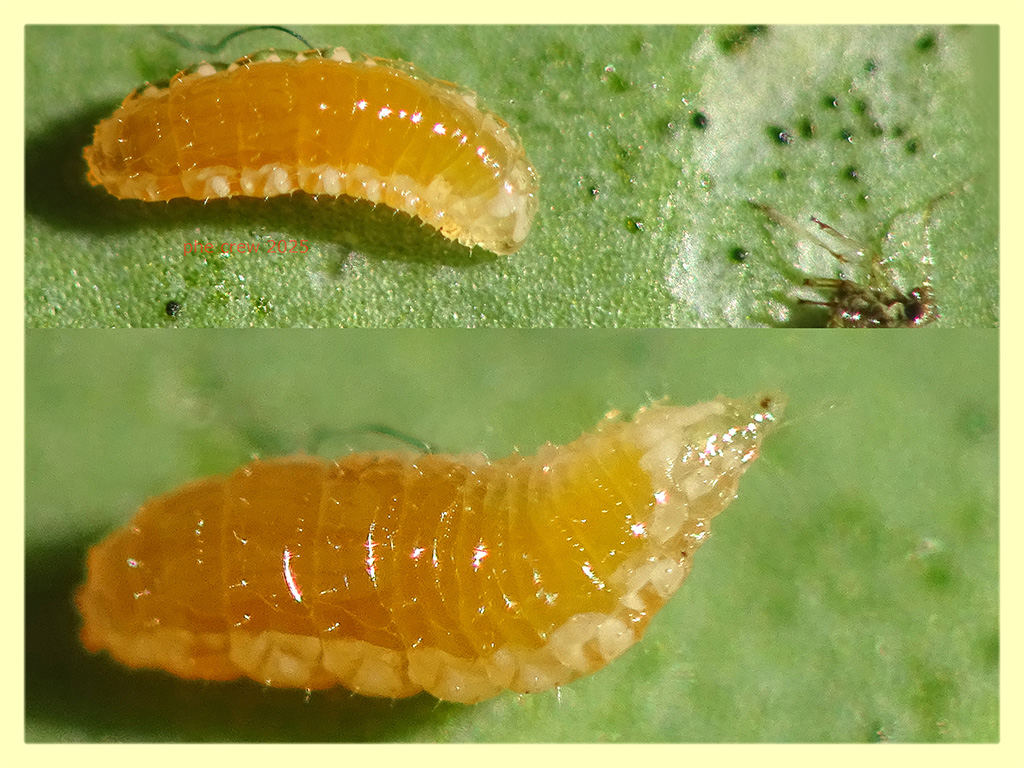 ...dovrebbe essere Aphidoletes aphidimyza, un Cecidomide le cui larve sono cacciatrici di Afidi. Infatti da queste foto lo si vede....ho fotografato solo larve ! Le piu' grandi arrivano quasi a 2,5 mm., gli adulti non l' ho scovati....ne sto allevando alcune proprio per fotografare gli adulti....speriamo bene, altrimenti nisba ! In una foto si vede anche un piccolo uovo.