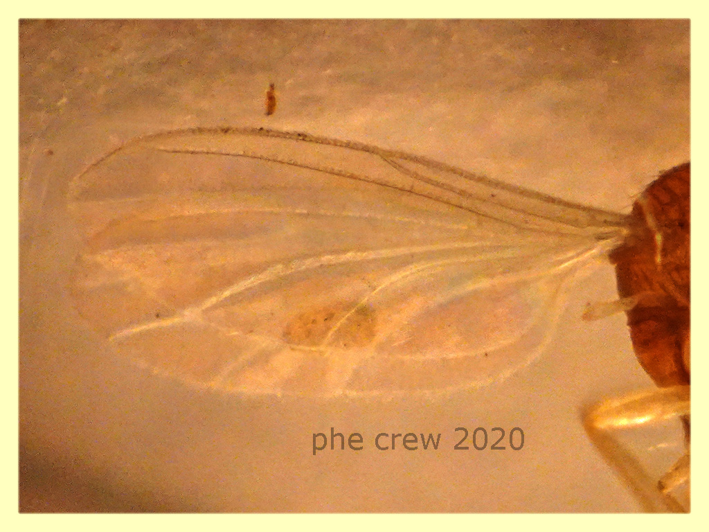 Quest'altro non c'entra nulla. Dalle ali mi pare uno Sciaroideo, si notano infatti gli speroni tibiali sviluppati e le coxe mediane e posteriori allungate. Anche qui è difficile andare oltre Sciarodidea sp. per gli stessi motivi di cui sopra.
