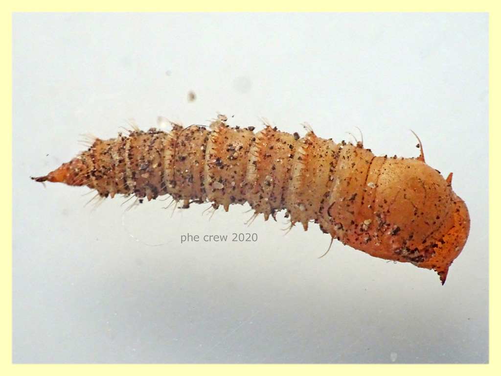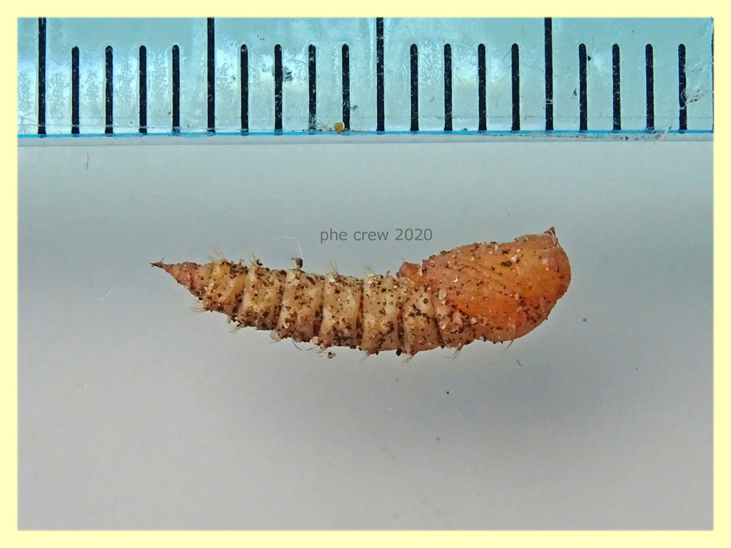 La pupa in foto è un po' curvata ma diritta misura 13 mm. Presenta una serie di peli tipo uncini.