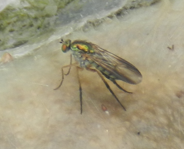 Mi sembra un Dolichopodidae. Le foto però sono troppo confuse; io non riesco ad andare oltre.