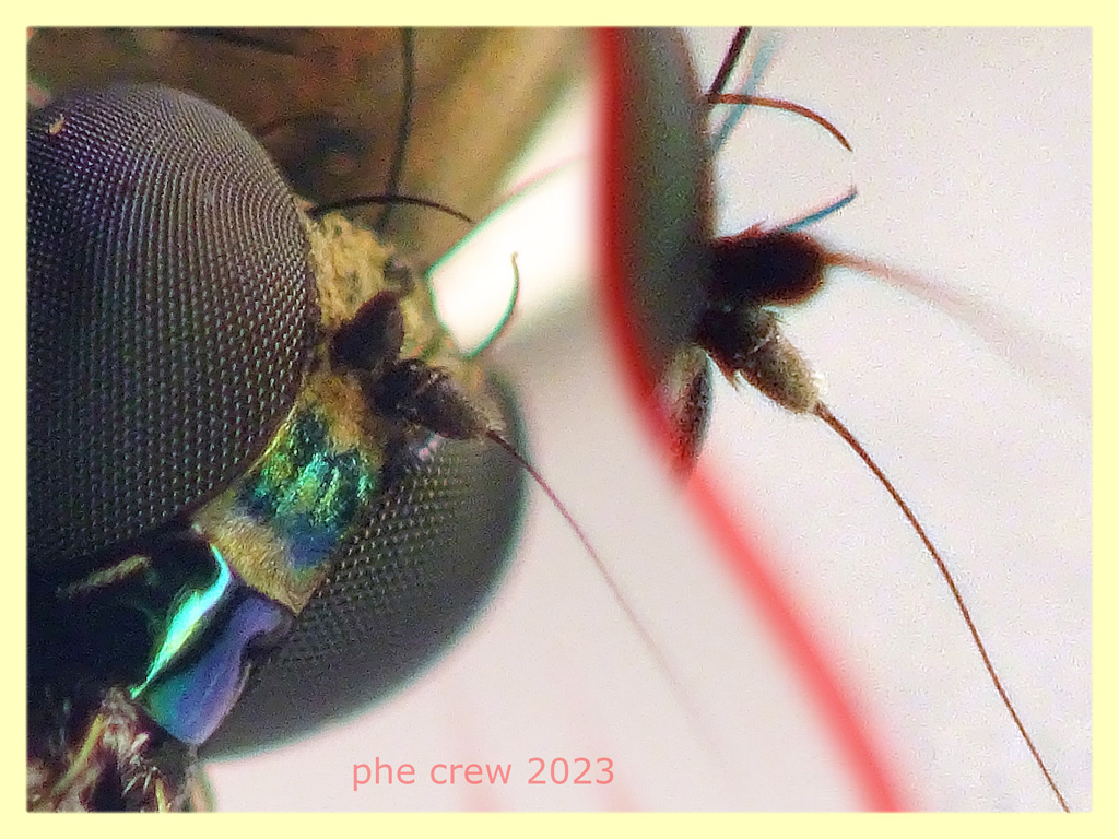 ...questo e' un esemplare fotografato in natura mesi fa', precisamente il 4.6.2023. Ho, da queste poche foto in natura, cercato grossolanamente di arrivare ad una identificazione....ma non ci sono riuscito. Quindi una ventina di giorni fa (infatti la data del post e' proprio quella di quel giorno) sono andato ad acciuffarne uno proprio sullo stesso albero di Eucalipto. Credevo che non fosse piu' periodo di svolazzamento....invece c' erano....circa una decina che giravano veloci zompettanti e a piccoli voli tutt' intorno al tronco per non farsi prendere. So che sono assidui sgranocchiatori di Collemboli e non solo....e qui l' idea.....ho scortecciato un po l' Eucalipto e decine di Collemboli alla rinfusa si misero a correre sul tronco. Eccoli ! subito in arrivo con le loro faccette da assassino che si avvicinavano veloci ai malcapitati insettini. Prima di colpirli prendevano la mira mettendosi in posizione parallela al tronco con l' addome per un secondo, praticamente alzavano anche le zampe posteriori che di solito in posizione di fermo o riposo sono quasi coricate assumendo la classica postura cioe' con la punta dell' addome quasi appoggiata alla superficie (come nelle seconda foto). Mentre erano indaffarati a rimpinzarsi ne presi uno. Non sapendo come descriminare maschio e femmina ho seguito le chiavi per le femmine e con un po di difficolta' (causa della mia apparecchiatura scrausa) si arriva al genere Medetera sp.. Dunque le foto che postero' piu' avanti evidenzieranno i dettagli per questo genere.