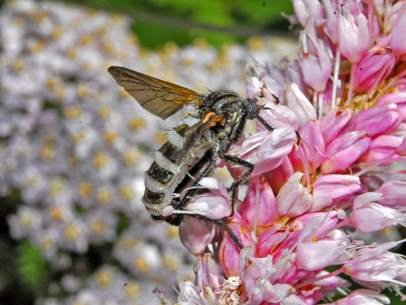 Penso che si sia lasciato fotografare senza tentare di scappare. Quelle strisce bianche mi ricordano altre immagini di insetti uccisi da un fungo. In ogni caso non è un Syrphidae, ma non riesco a leggere abbastanza bene la venatura e non avanzo altre ipotesi.