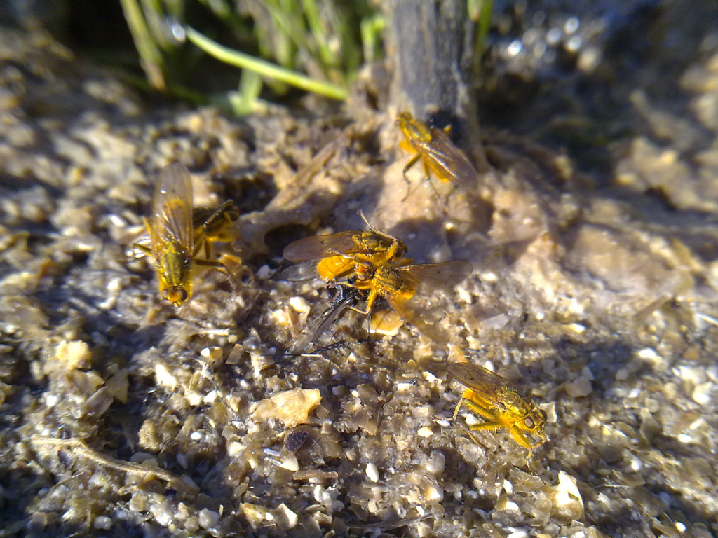 Non ho ben capito se si nutrano dello sterco o delle mosche comuni che ne sono attratte (foto 2). Fatto sta che le malcapitate finiscono morte o morenti (foto 3).
