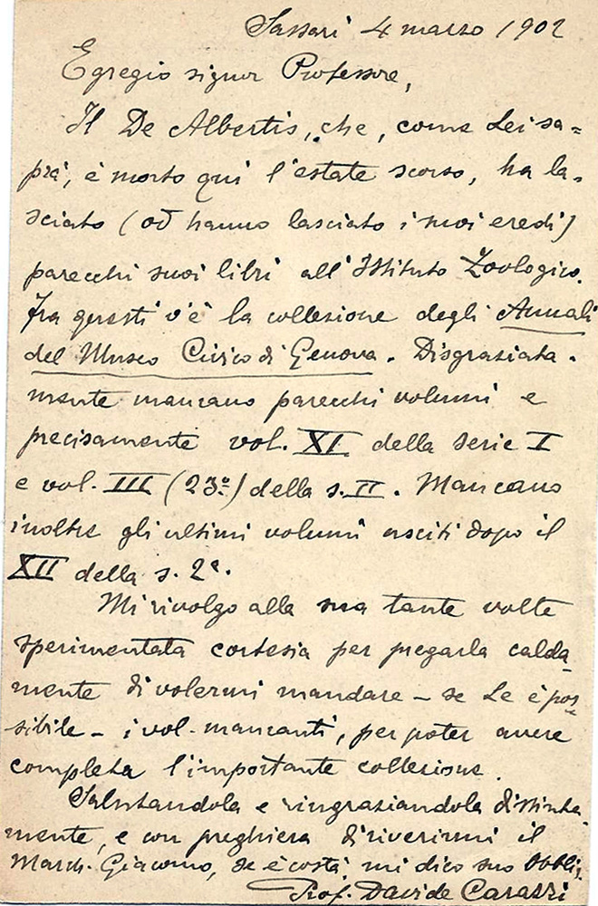Il De Albertis, che, come Lei saprà, è morto qui l’estate scorso, ha lasciato (od hanno lasciato i suoi eredi) parecchi suoi libri all’Istituto Zoologico. Fra questi v’è la collezione degli Annali del Museo Civico di Genova. Disgraziatamente mancano parecchi volumi e precisamente vol. XI della serie I e vol. III (23°) della s. II. Mancano inoltre gli ultimi volumi usciti dopo il XII della s. 2a.