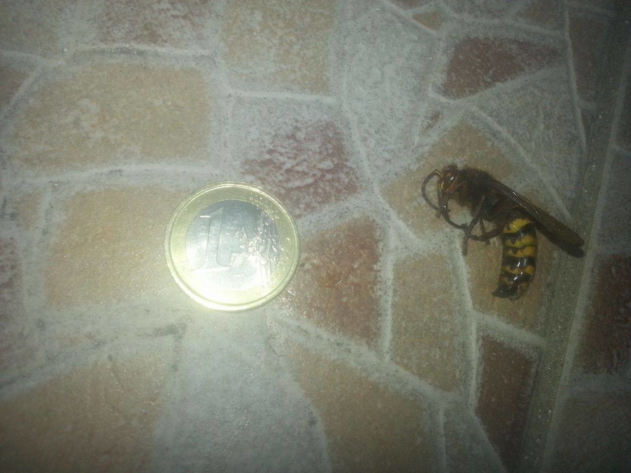 Giusto ieri, sono rientrato e ho visto il mio gatto intento ad osservare una di queste vespe enormi che era rimasta chiusa tra una porta finestra e la zanzariera - faceva un rumore talmente forte che si sentiva all'interno, nonostante i doppi vetri... oggi l'ho ritrovata morta e l'ho fotografata assieme ad un altro esemplare di dimensioni più piccole ( o forse essiccato, perché è una veranda dove batte il sole per buona parte del pomeriggio) che stava a pochi cm.
