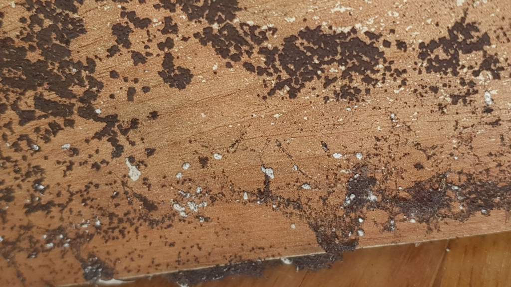 Continuando la pulizia ho smontato i pannelli a sostegno della scrivania e ho trovato una situazione insalubre a prescindere dagli animaletti in questione,... tanta muffa forse dovuta al fatto che sulla parete opposta c'è il bagno e le tubature (pur non perdendo acqua perchè il muro è asciutto) in particolari occasioni creano condensa con conseguente umidità.
