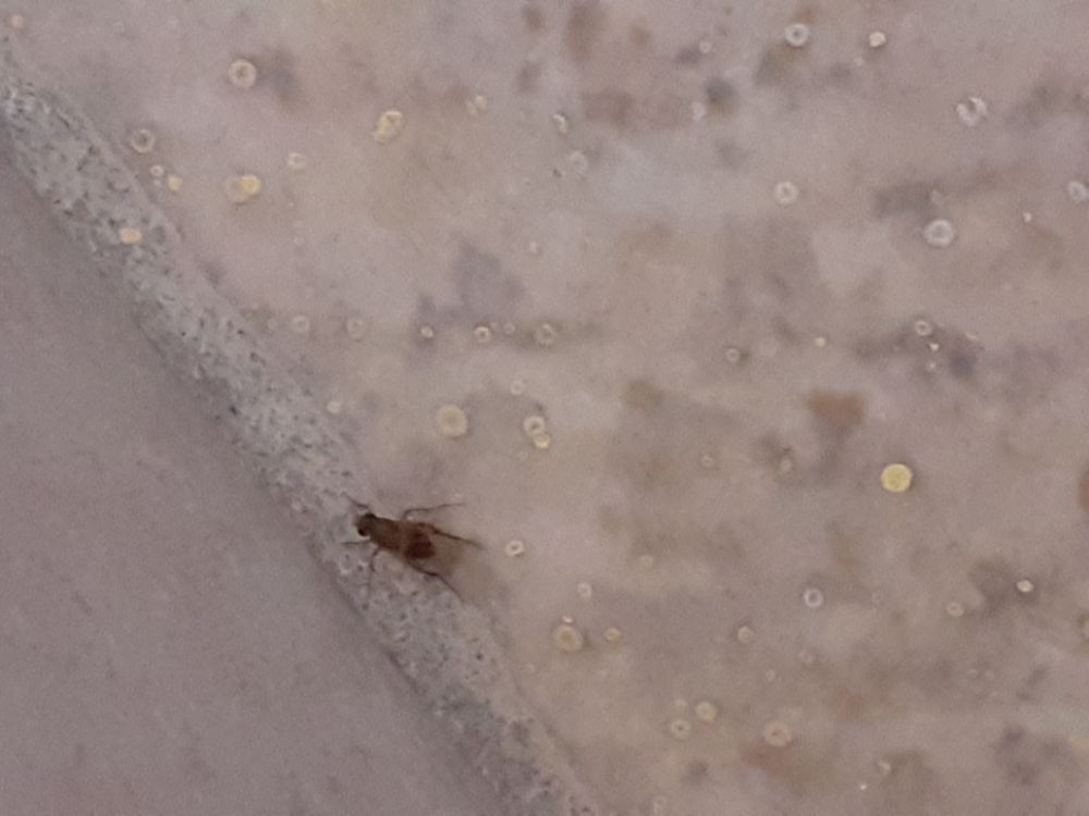Di Psocotteri ve ne sono di vari colori, per lo più castani, bruni o grigiastri, chiari o scuri. La foto inizialmente inserita rimanda senza dubbio a Psocotteri. Le altre due foto sono meno 'leggibili', quindi sul 'vermetto' (larva) non mi pronuncio; sul dittero adulto posso dire che ricorda i Foridi (ad esempio il genere Megaselia), senza avere la certezza che lo sia. Che cosa fanno i ditteri? Fanno tantissime cose, molto diverse da caso a caso. I Foridi non di rado hanno uno sviluppo larvale legato a sostanze umide in decomposizione, derrate alterate da umidità, ecc.: ovvio che per lo sviluppo di un singolo individuo è sufficiente una minima quantità di tali 'risorse', ma non è affatto detto che questo 'moscerino' si sia sviluppato in casa: può semplicemente esservi entrato come adulto. I fattori che portano gli insetti a entrare nelle nostre abitazioni sono svariati, diversi da caso a caso: ad esempio, casuale 'dispersione' attiva o passiva (non di rado causata dal vento), ricerca di condizioni di temperatura, luminosità od ombrosità più confortevoli per le loro esigenze, ricerca di fonti alimentari o di siti dove riprodursi (questo riguarda però solo un numero limitato di specie), ecc.
