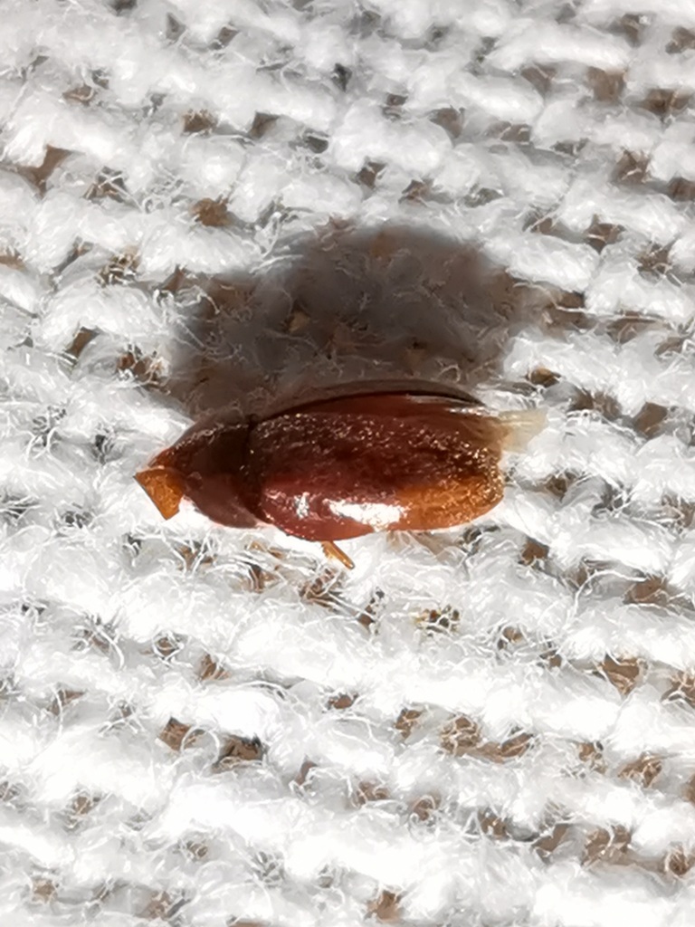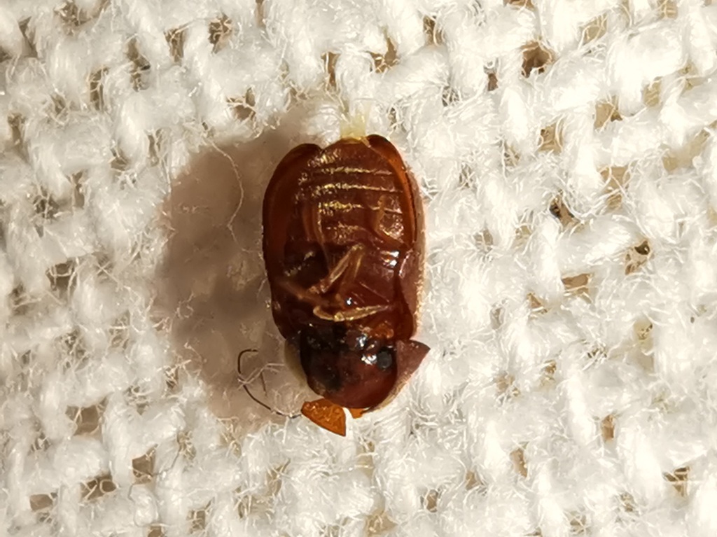 Si tratta di un Coleottero assai malconcio. La foto più informativa è l'ultima, che fa pensare all'Anobiide Lasioderma serricorne. Le antenne (discretamente lunghe e finemente seghettate, se la specie fosse quella) possono essere non visibili perché riparate ventralmente, oppure possono essersi staccate in parte o interamente per il trauma. Possibile la provenienza dalla dispensa della cucina, dove le sue larve, molto meno visibili, possono svilupparsi a spese di varie derrate vegetali secche anche polverose (farina), comprese spezie e camomilla. In questa sezione del forum si trovano sicuramente altre discussioni che citano questa piccola specie e le sue malefatte nelle nostre derrate.