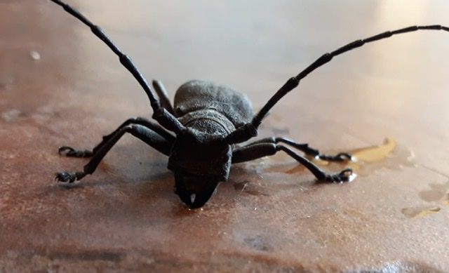 Si tratta di una femmina di Morimus asper, un coleottero cerambicide le cui larve si sviluppano nel legno morto di diversi tipi di piante. Sonno totalmente innocui. Avete della legna in casa? |