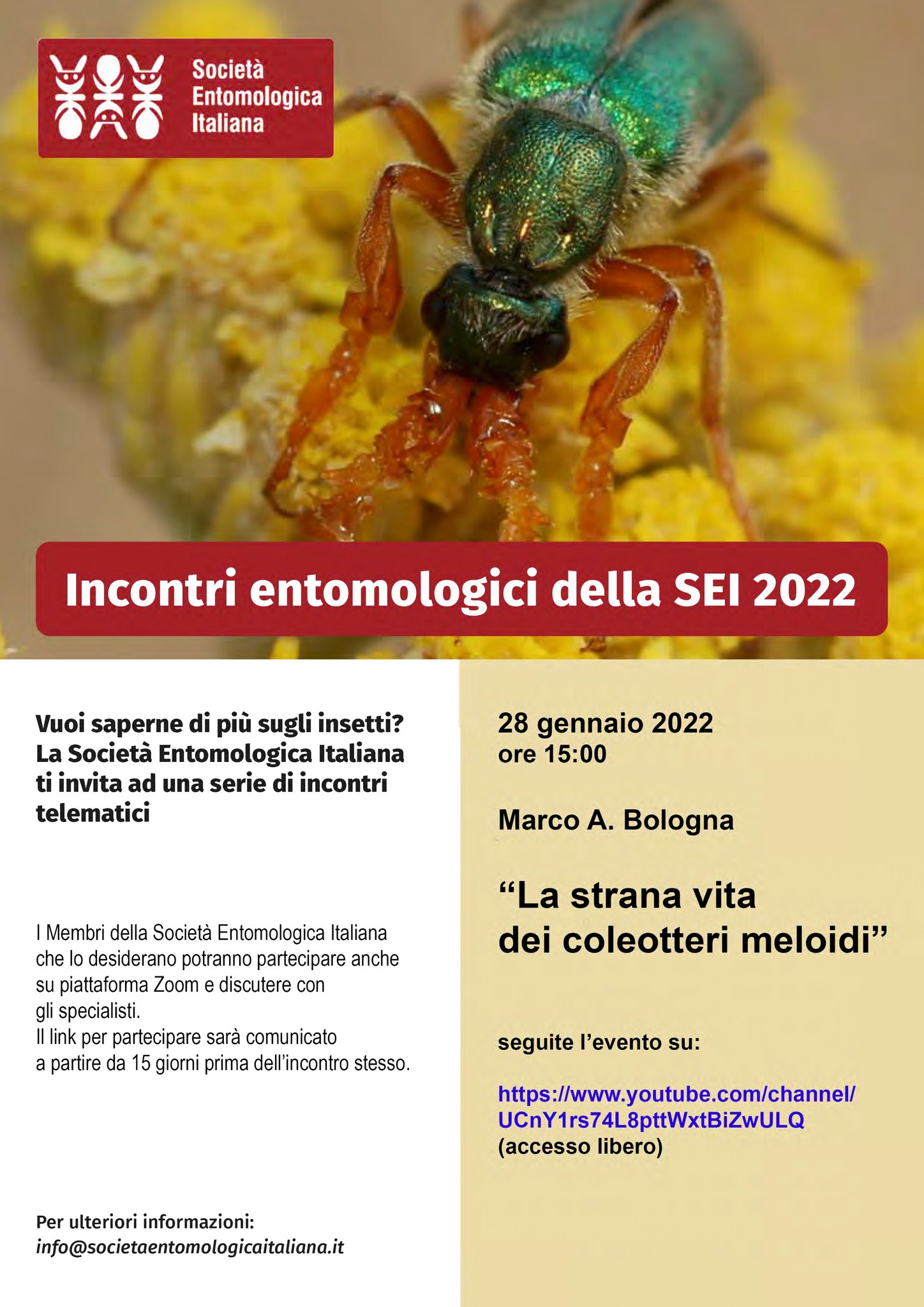 ll primo incontro tenuto dal Prof. M. A. Bologna, dal titolo “La strana vita dei coleotteri meloidi” sarà il 28 gennaio alle ore 15:00 e sarà liberamente usufruibile sul canale YouTube della Società, al seguente link: https://www.youtube.com/channel/UCnY1rs ... WxtBiZwULQ