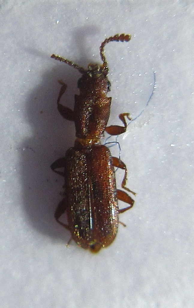 Buonasera a tutti, questo insetto l'ho trovato sotto corteccia. È abbastanza strano con quel pronoto lungo, stretto e con un'unica fossetta. Di chi si tratta? Lunghezza 3,50 mm Grazie in anticipo, Mattia