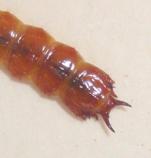 Secondo me la larva non è ancora del tutto matura e quindi le sue caratteristiche morfologiche non sono ancora "definitive". Guarda quella più piccola ad esempio come ha diversa la struttura del IX segmento addominale.