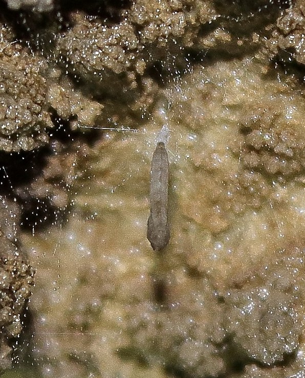 Salve. Ho fatto queste foto in una grotta. Penso si tratti dello stesso insetto (speolepta leptogaster?), allego foto di larva, pupa e insetto ormai morto rimasto attaccato al soffitto.