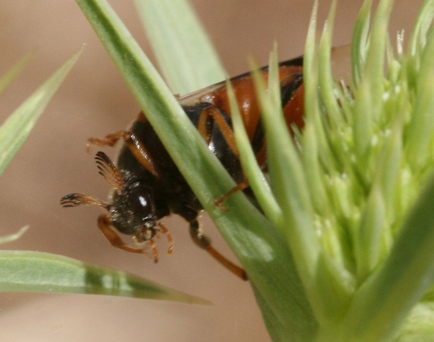 Strano coleottero, é diffidente e vola come un imenottero, le antenne sono come quelle di un cervo, le elitre sono trasparenti e molto piccole, le ali ben evidenti, non credo sia particolarmente comune, lo incontro una volta all'anno sulle stesse piante di Eryngium campestre.