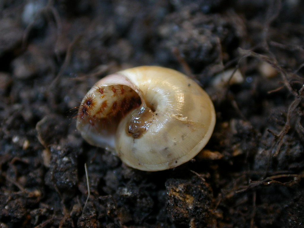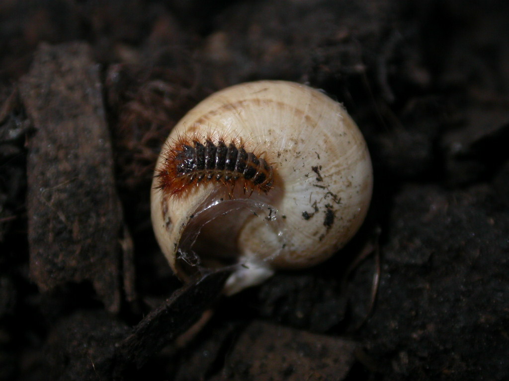 Piccolo aggiornamento: la larva in questione, dopo essersi cibata di una chiocciola, vi ha compiuto all'interno una muta (nella foto si vede l'esuvia) ed è nuovamente uscita con un apprezzabile aumento di taglia. Ora è alle prese con un'altra chiocciola.
