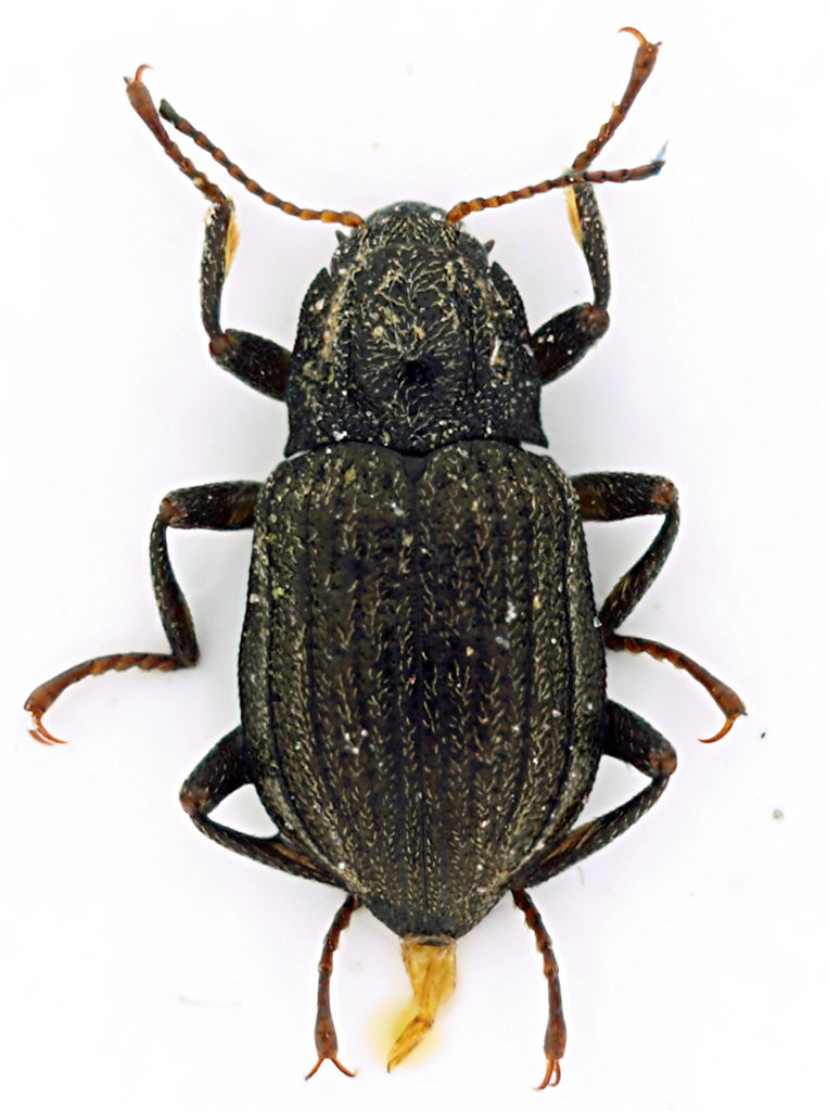 I solchi laterali del pronoto raggiungono il bordo posteriore del medesimo e non sono collegati da una depressione trasversale, lo scutello è piccolo e molto più lungo che largo.