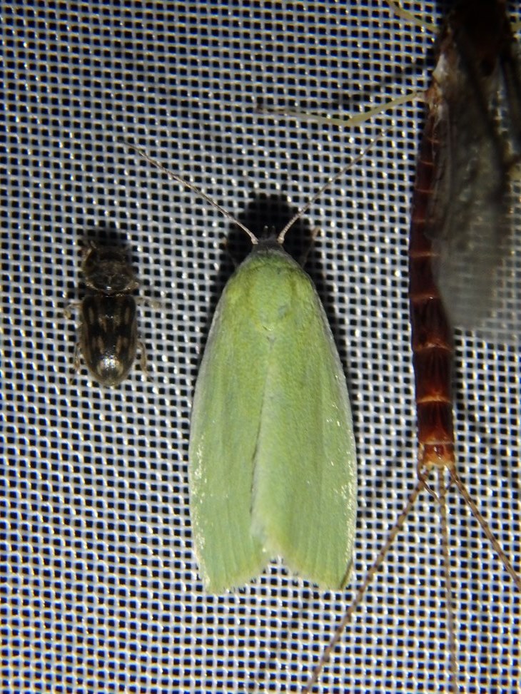 ieri notte, durante un censimento degli invertebrati con luce UV ho fotografato per determinarla questa farfallina di circa 10 mm.(Earias clorana, L.1761), ma ingrandendo la foto in seguito ho notato il piccolo coleottero a fianco, sui 4/5 mm. e non ho alba di cosa possa essere, nemmeno la famiglia e tantomeno il genere...qualcuno sa darmi qualche dritta?
