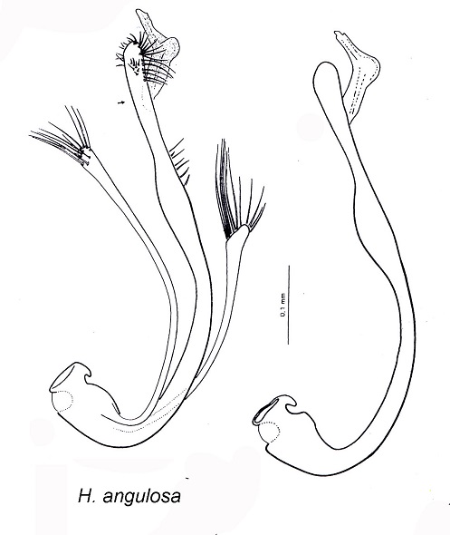 Direi che è proprio H. angulosa, d'altronde da quelle parti c'è (io l'ho raccolta nel comune di Villa Minozzo nel reggiano e vicino Fanano nel Modenese). In verità l'edeago visto nella tua foto sembra un po' atipico se confrontato con i disegni in