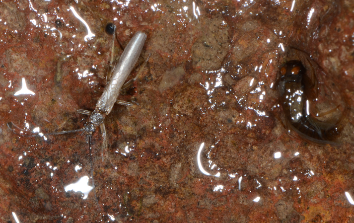 Trovato sotto un sasso in un torrente. Sembrerebbe un Plecoptera ... Non credo si possa andare oltre, giusto? Aggiungo un campo più largo per includere la strana larva alla destra del presunto plecoptera, che probabilmente è ancor meno determinabile, ma merita di essere vista per l'aspetto alieno. |