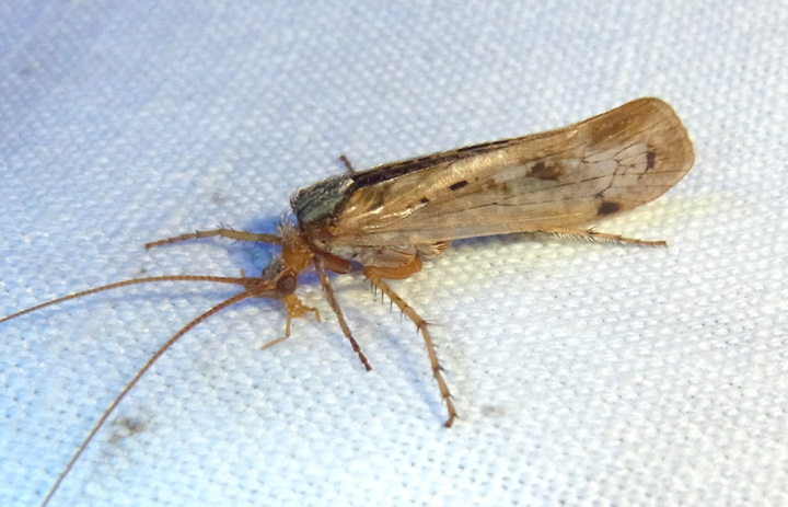 Questo grosso tricottero me lo sono ritrovato ieri sera sul telo, durante una delle mie, oramai periodiche e consolidate raccolte notturne, organizzate furbamente sul terrazzo di casa. In questa occasione con il disperato tentativo di agguantare qualche bel Cebrio che come al solito non si è fatto vedere. Sarei curioso di conoscere almeno la famiglia, visto che di così grossi e soprattutto di così strani non ne avevo mai visti. Grazie! Dimensioni 20 mm ca. |
