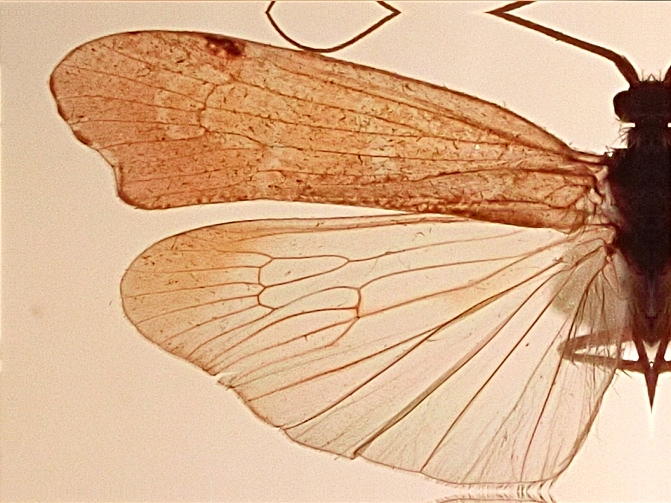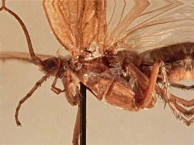 Il bordo dell'ala anteriore è molto caratteristico, si tratta di Glyphotaelius pellucidus.