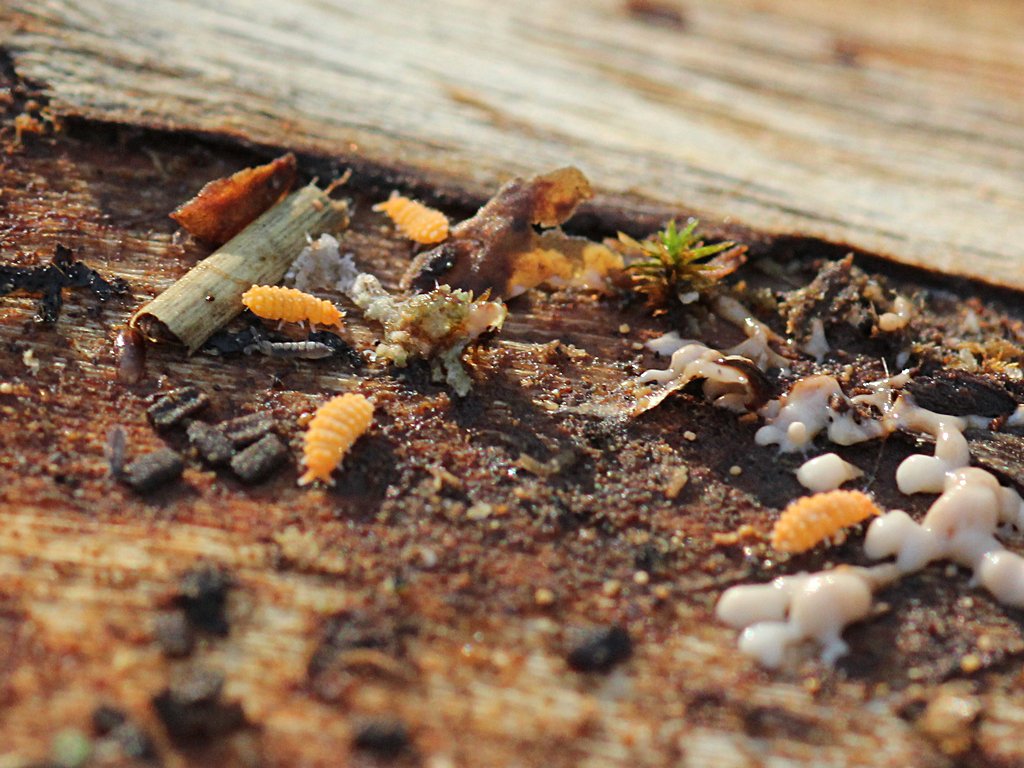 Un gregge di pecorelle arancioni in un prato di mixomiceti Chi trova la pecora nera? Lazio, Roma, Cervara, 14.XI.2011, sotto corteccia di pino morto |