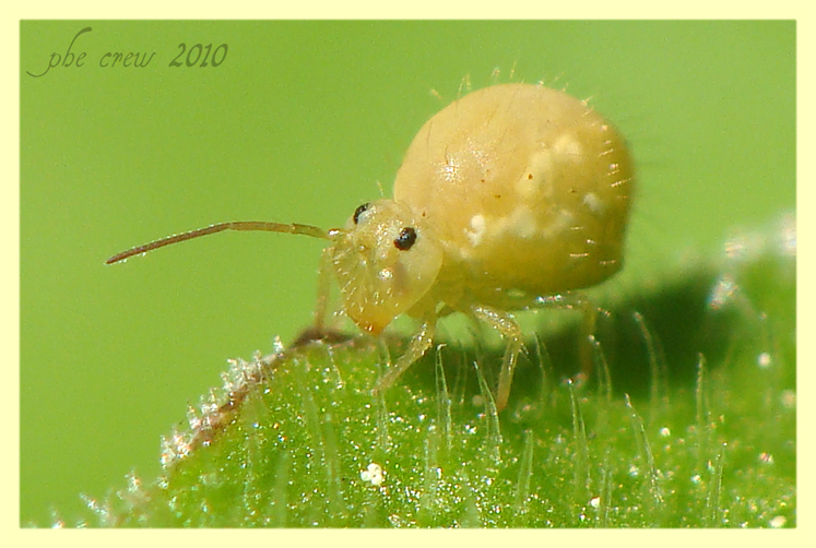 ...questo in foto dovrebbe essere Sminthurus viridis , che (leggendo in internet) provoca ingenti danni all' agricoltura, specialmente sulle foglie, provocando delle piccole e tonde erosioni.