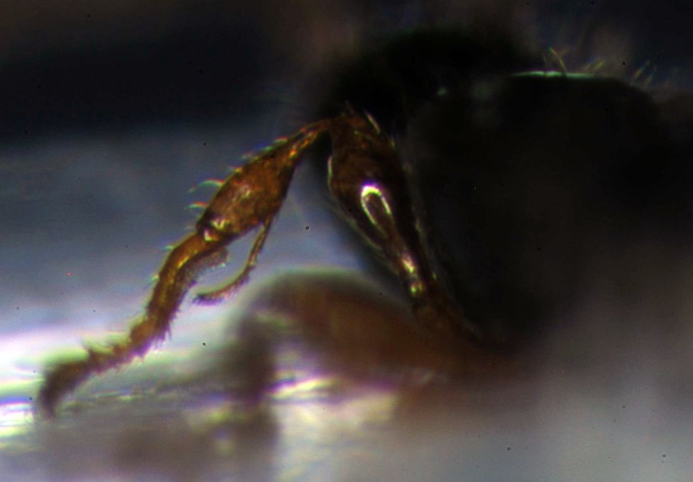 La "spina" sulle tibie anteriori è lo sperone per la pulizia (lo "strigile"): ce l'hanno tutti gli imenotteri, più o meno sviluppato e inserito più o meno distalmente sulla tibia. E' articolato alla tibia, non è una vera spina. Il primo articolo del tarso anteriore è anche modificato (come si vede bene nella foto) e, insieme allo sperone, costituisce un'organo per la pulizia delle antenne e delle altre appendici.