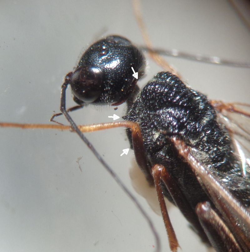 Visto che sto fotografando i miei Gasteruption, ne approfitto per altre due foto di questa specie, che mostrano alcuni dettagli importanti come la carena occipitale piuttosto larga (alta) e le due espansioni acute, molto tipiche, della parte frontale del protorace. ![]()