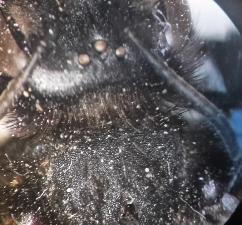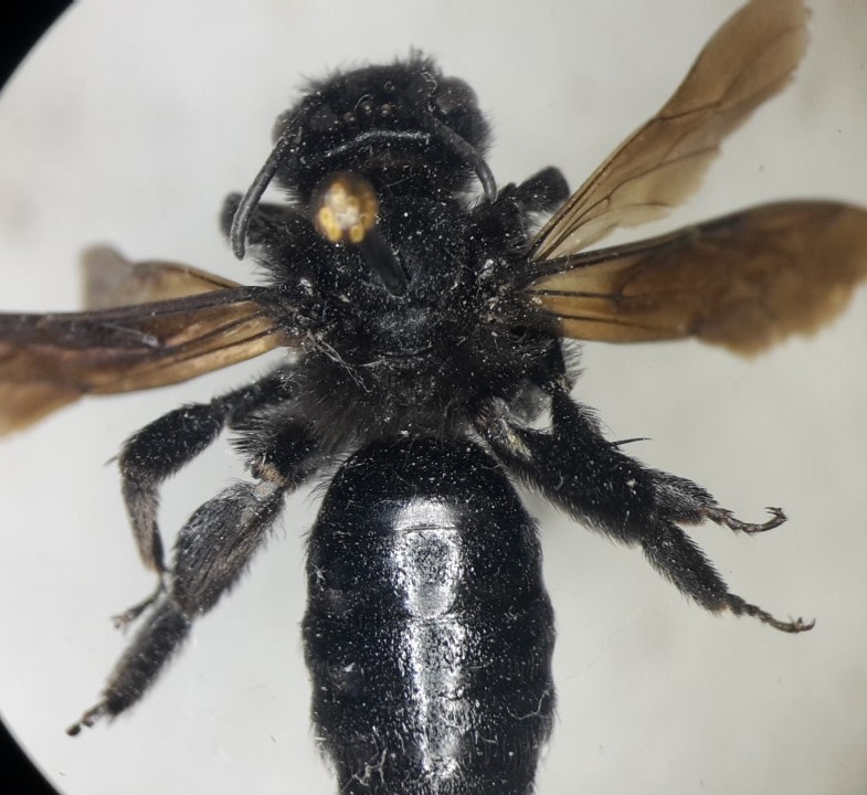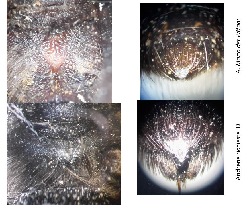 Qua in collezione abbiamo una A.morio femmina. Per dimensioni e colorazioni dei peli le due Andrene sono pressoché identiche trovo molto curioso tuttavia che ci siano delle differenze marcate nella forma della placca pigidiale: molto allungata e lucida nell'individuo di cui ho fatto la richiesta di determinazione e più larga nell'individuo della collezione e nell'alveolatura del propodeo: molto più marcata nell'individuo della collezione (vedi figure). Potrebbero essere due sottospecie differenti di A.morio?