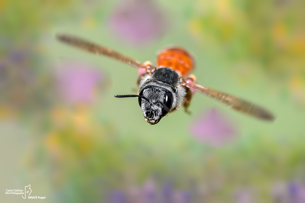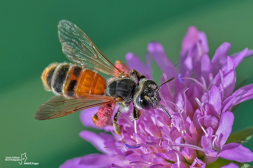 Grazie. Si in effetti quello che mi ha sempre colpito di questa specie è l'enorme quantità di polline rosa o rosso che fa sembrare l'insetto dello stesso colore