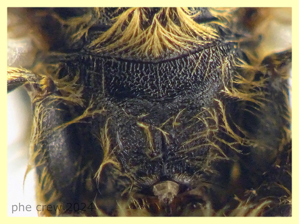 ...ho fatto due foto al volo, la fossetta sembra che ci sia. e poi la foto con la punctuazione del propodeo...comunque stavo leggendo atlashymenoptera.net - Halictus d'Europe e ce ne sono molte simili come habitus anche nella vicina Francia, ma non mi sono intrufolato a vedere se ci fosse un propodeum uguale al mio...