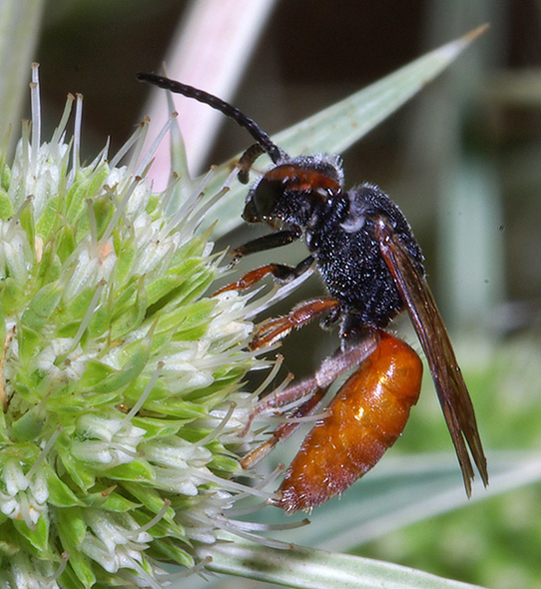 Ho foto di di diversi Sphecodes, credo di almeno tre specie diverse; ma queste tre foto che allego credo siano tutte di un'unica specie: piuttosto grossa (per uno Sphecodes naturalmente), e con zampe chiare invece che nere come nelle altre specie che trovo in Sardegna. Ho pensato possa essere Sphecodes albilabris (Fabricius 1793).