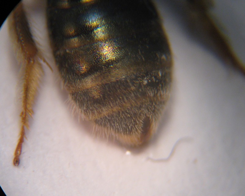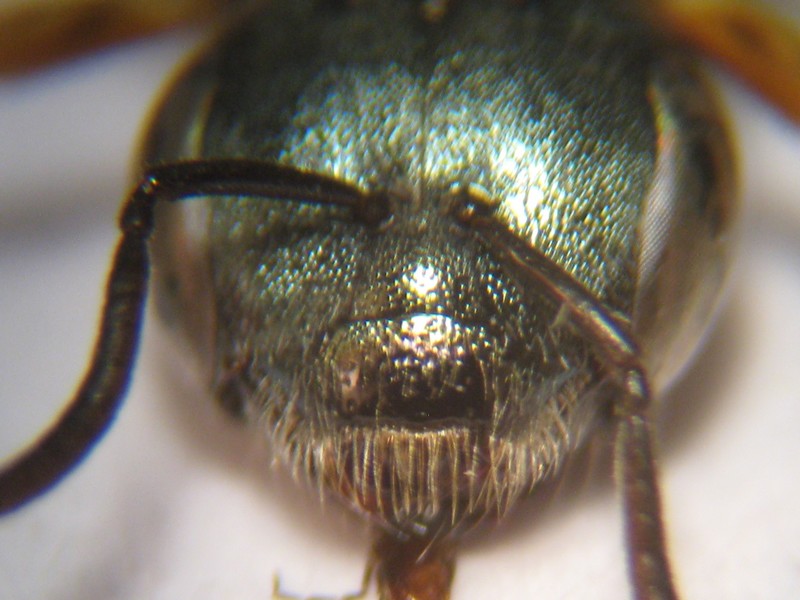 Si tratta di un Halictus del s. genere Seladonia. Mi sembra un maschio ma ho qualche dubbio, la femmina dovrebbe avere il tergite 7 diviso in due da una linea longitudinale.