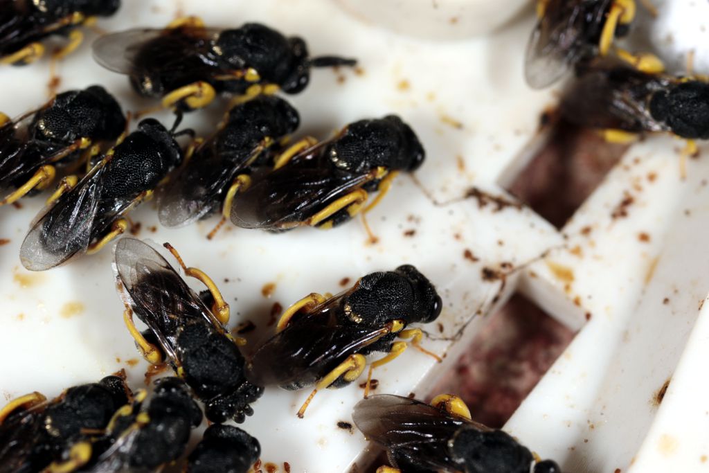 Qualche giorno fa per cambiare le pile alla sonda esterna di un termometro ho scoperchiato… un nido di vespine. Non conosco gli imenotteri, chi mi sa dire la famiglia e magari anche qualcosa di più di questi piccoli gioielli? Lunghezza 5,5 mm.