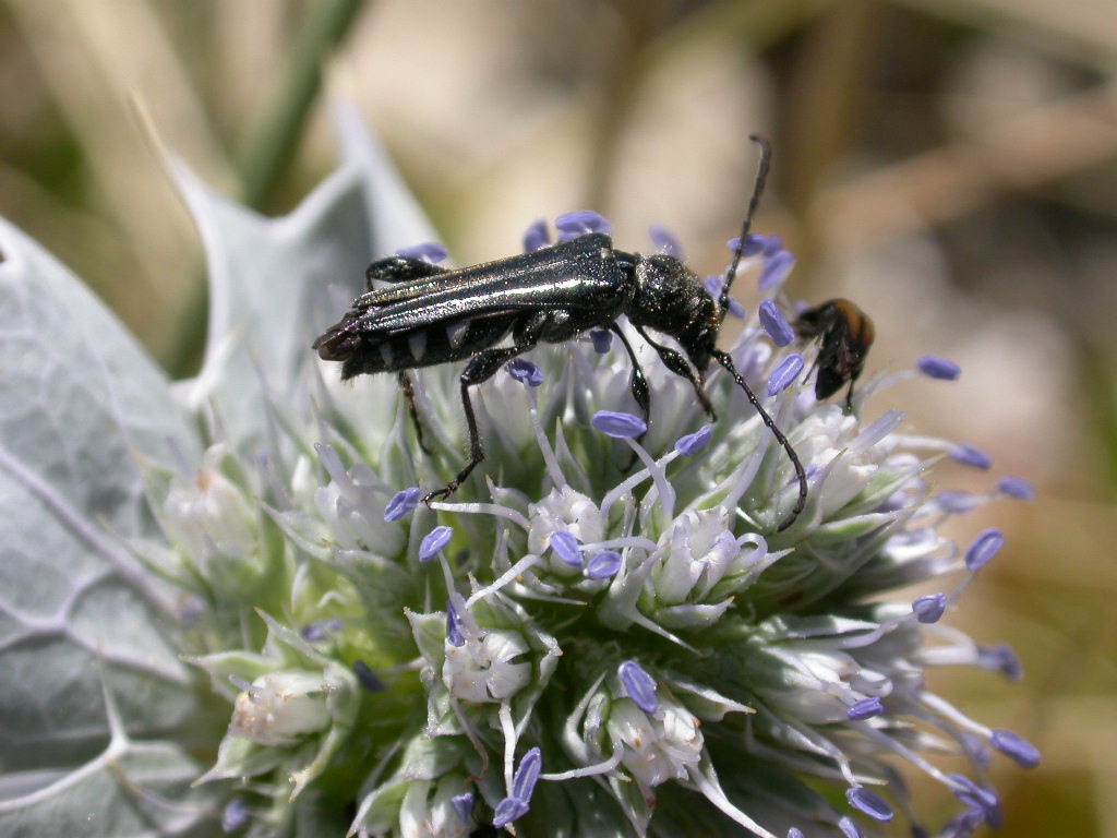 Nelle zone sabbiose era in fioritura l’Eryngium maritimum, mentre del Pancratium maritimum si vedevano solo le foglie. I fiori di E. maritimum erano frequentati da alcuni Stenopterus ater, Scolia sexmaculata e mordellidi su cui magari Enrico può dirci qualcosa (ovviamente li ho raccolti):